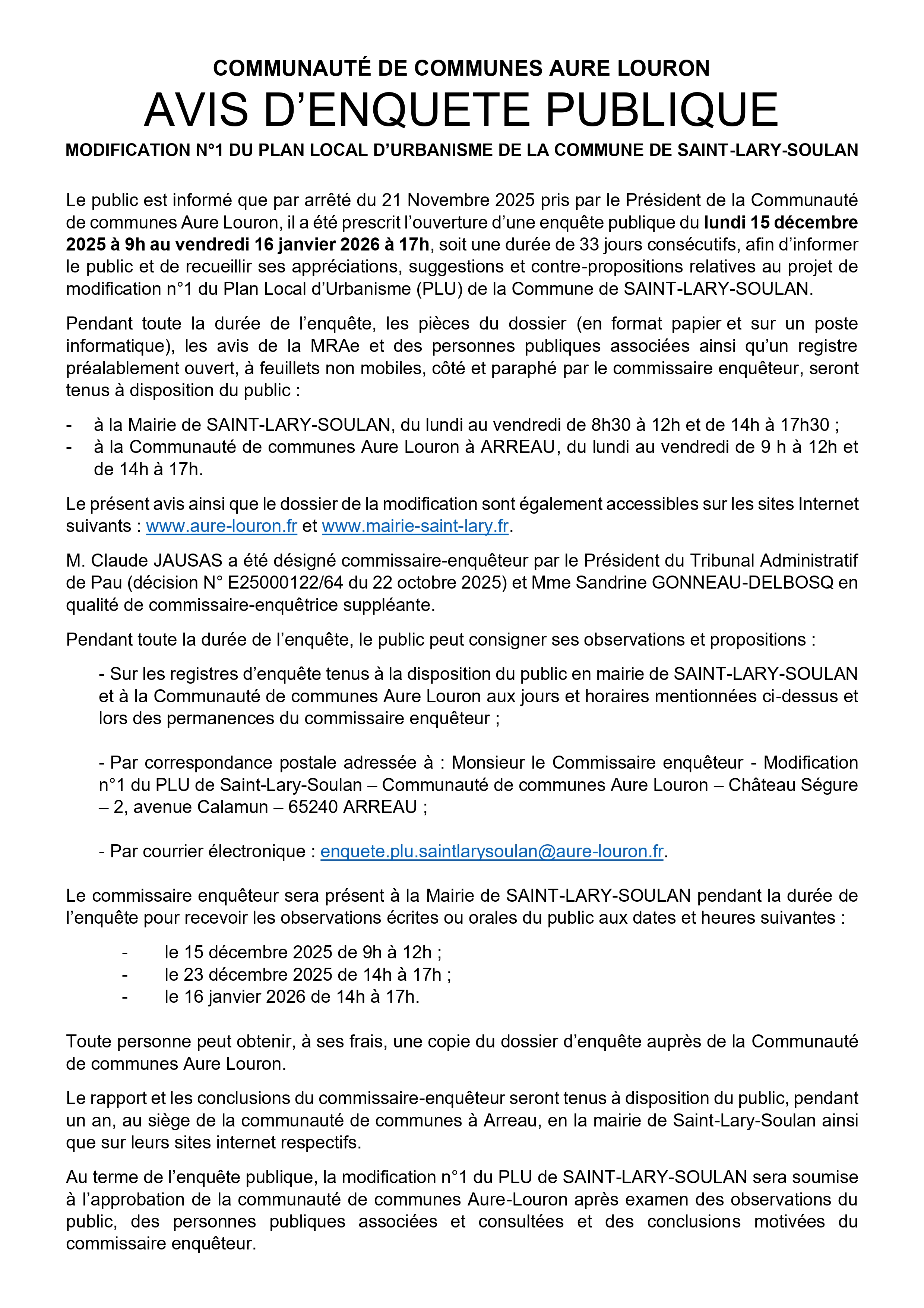 AVIS D’ENQUETE PUBLIQUE : MODIFICATION N°1 DU PLU DE SAINT-LARY-SOULAN