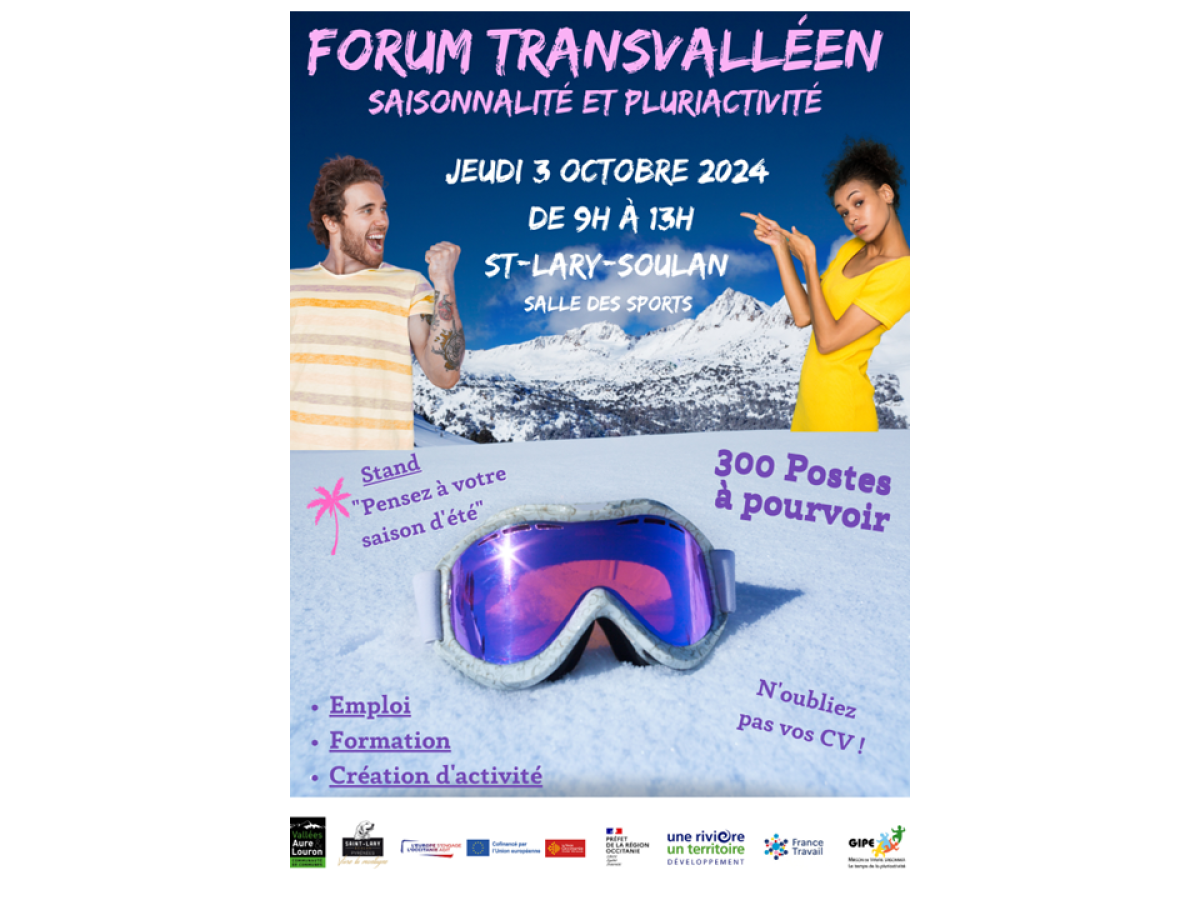 Le Forum pour l'emploi saisonnier et la Pluriactivité organisé par le GIPE et France Travail de Lannemezan aura lieu le jeudi 3 octobre 2024, de 9h à 13h, à la Salle des Sports de Saint-Lary-Soulan pour préparer le recrutement pour la saison d'hiver 2024/2025.