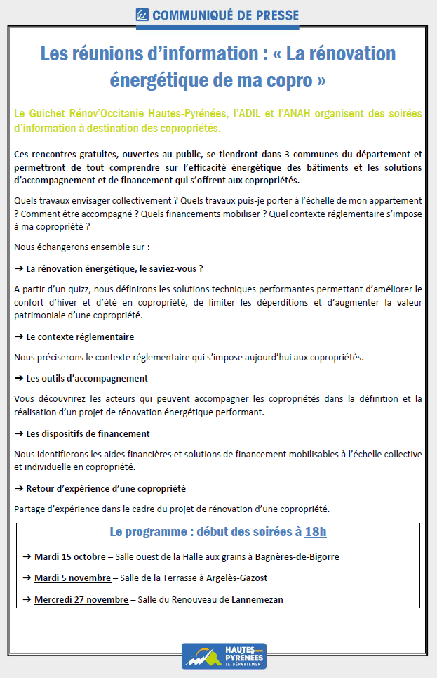 Le Guichet Rénov’Occitanie Hautes-Pyrénées, l'ADIL et l’ANAH organisent une réunion publique sur le département à 18h :
