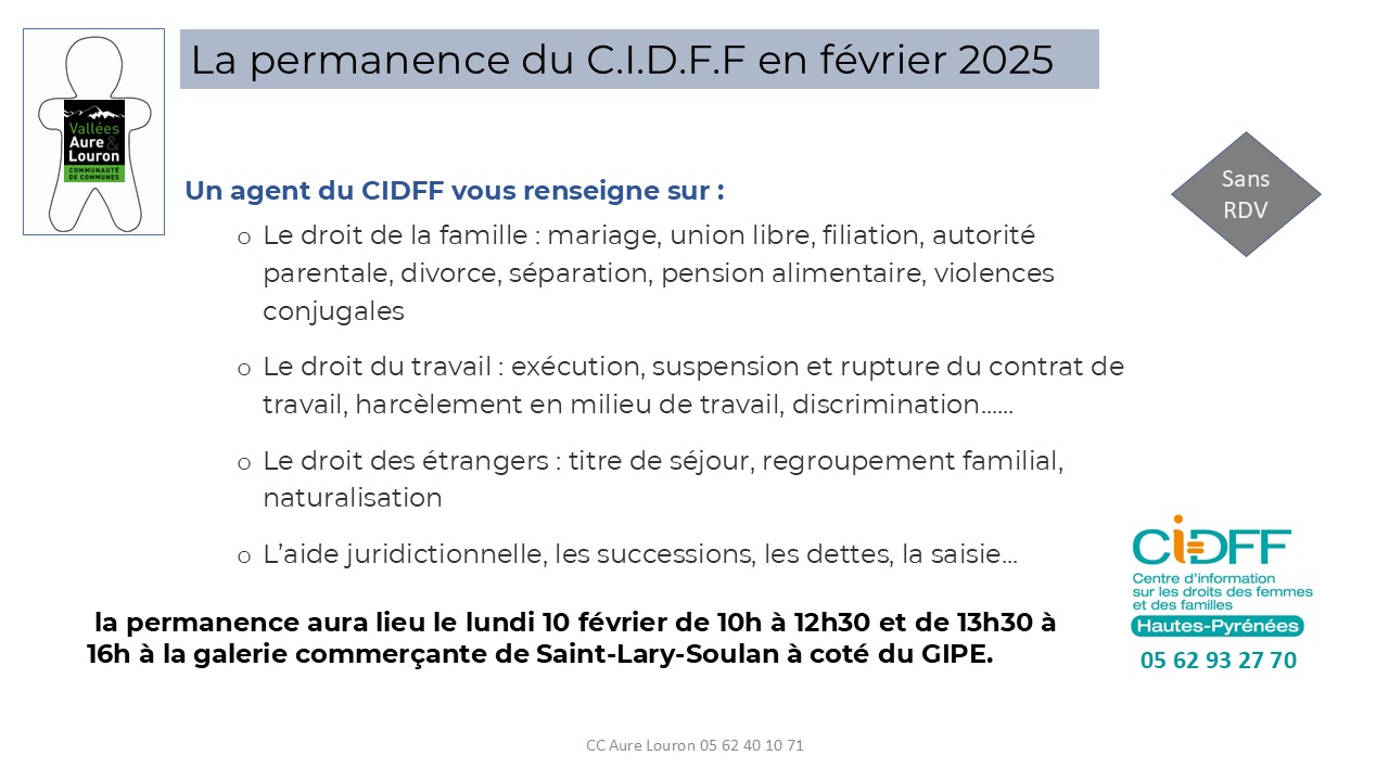 Les permanences en Février 2025 : DDFIP, Renov'Occitanie, OPAH, France Services, Maison du travail saisonnier, CIDDF, Mission Locale, Accompagnement social