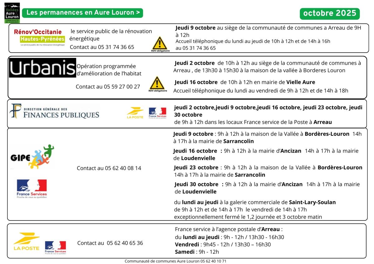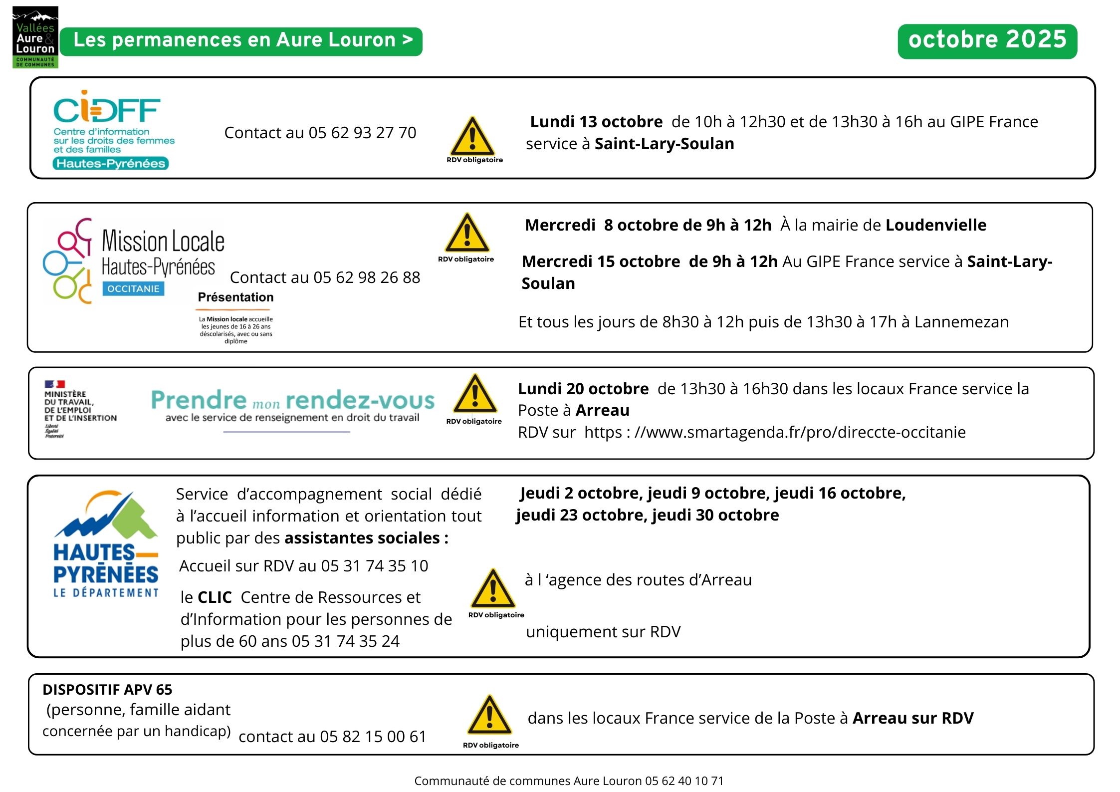 Les permanences en Octobre 2025 : DDFIP, Renov'Occitanie, OPAH, France Services, Maison du travail saisonnier, CIDDF, Mission Locale, Accompagnement social